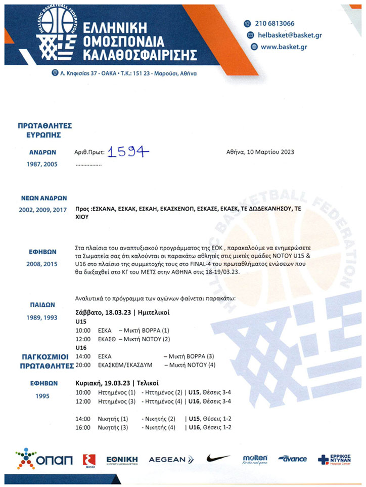 Στην Μικτή ομάδα Νότου γεννημένων το 2008 κλήθηκε ο Χρυσόστομος Χατζηλάμπρου του ΒΑΟΛ και το ερχόμενο Σαββατοκύριακο 18 και 19 Μαρτίου, θα συμμετέχει Final-4 της τελικής φάσης του πρωταθλήματος Ενώσεων και Τοπικών Επιτροπών, στα πλαίσια του Αναπτυξιακού Προγράμματος της ΕΟΚ, το οποίο θα διεξαχθεί στο ΜΕΤΣ. Το Σαββάτο θα αντιμετωπίσει την ΕΚΑΣΘ και την Κυριακή μια εκ των Μικτή Βορρά ή ΕΣΚΑ ανάλογα με τα αποτελέσματα του Σαββάτου.