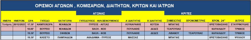 Αγώνες Τετάρτης 20 Δεκεμβρίου 2023