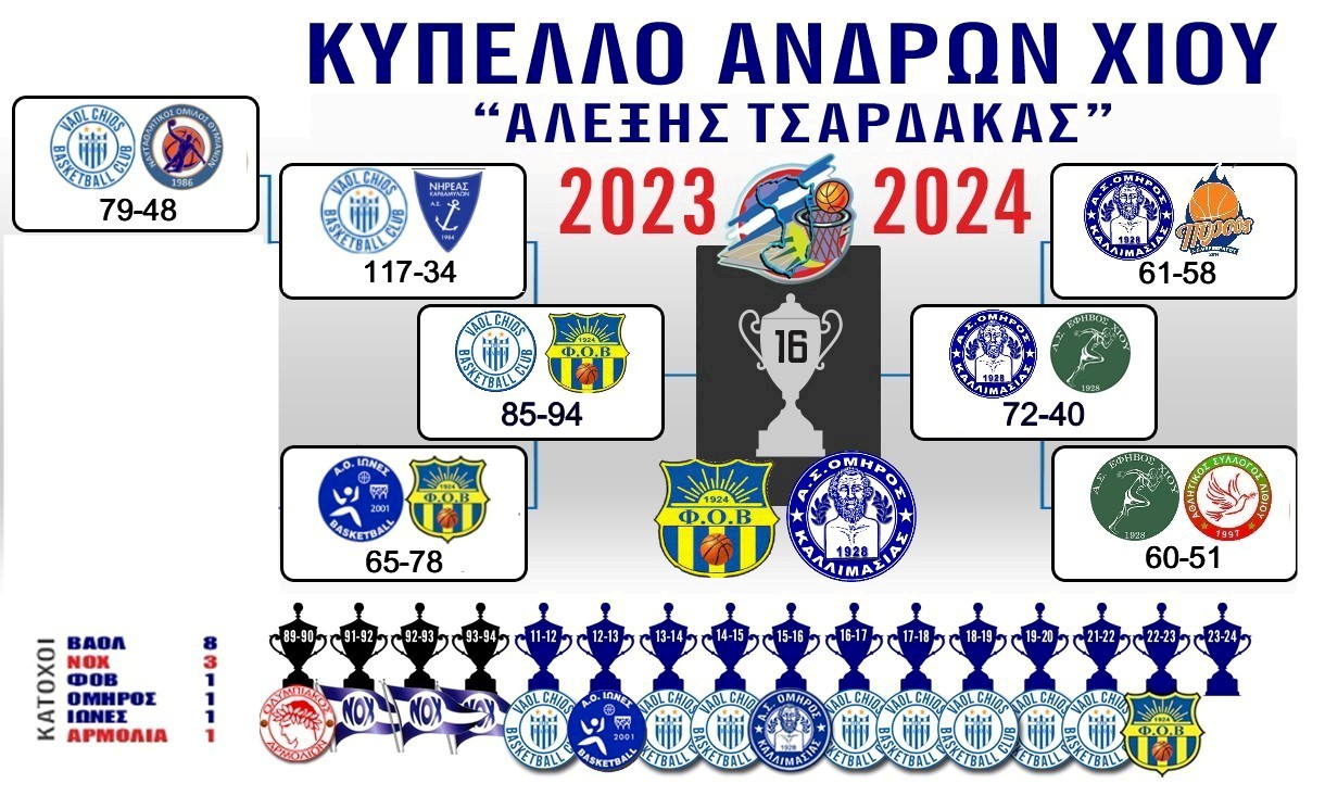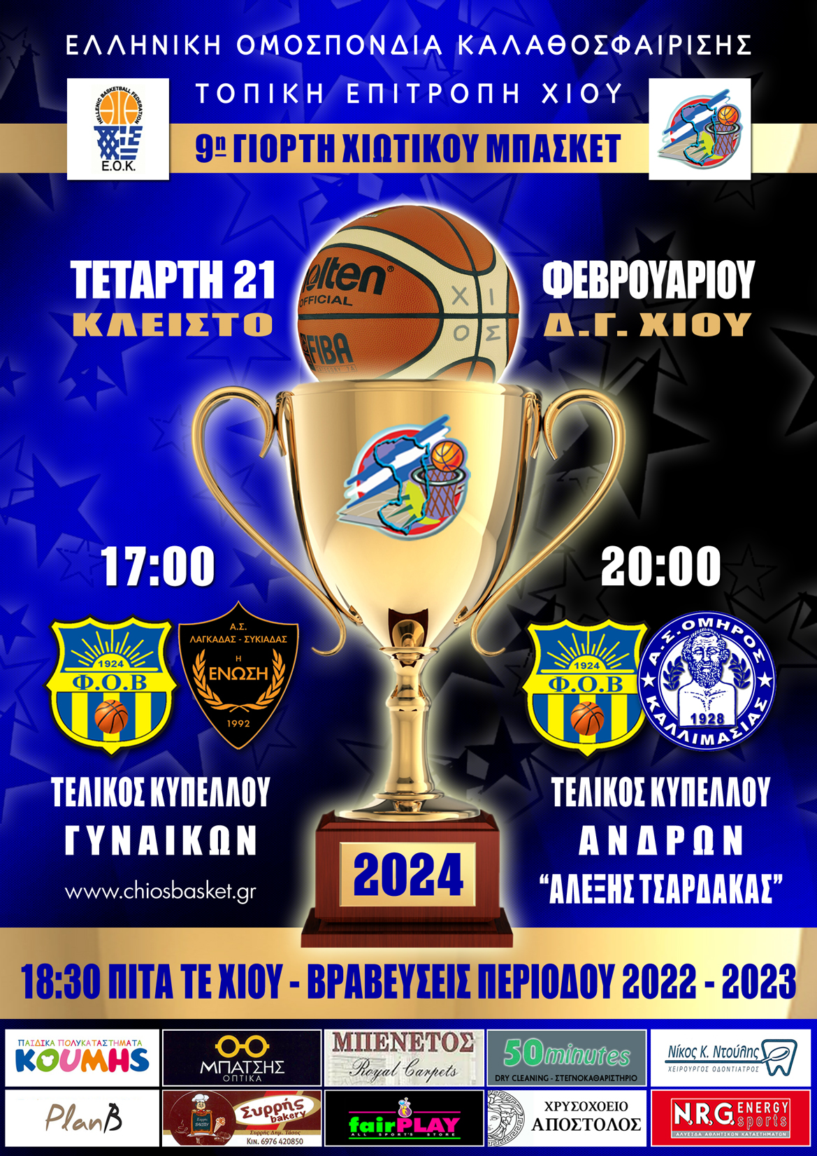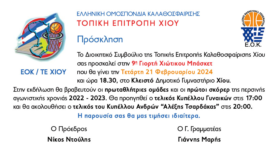 Την Τετάρτη 21 Φεβρουαρίου 2024 θα γίνει η καθιερωμένη γιορτή του Μπάσκετ 2024 στο Κλειστό Δημοτικό Γυμναστήριο Χίου. Η Γιορτή θα ξεκινήσει στις 5 με τον τελικό κυπέλου γυναικών μεταξύ του ΦΟΒ και της ΕΝΩΣΗΣ Λαγκάδας/Συκιάδας.