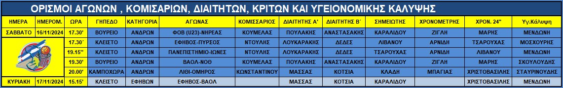 Aγώνες Σαββατοκύριακου 16-17 Νοεμβρίου 2024