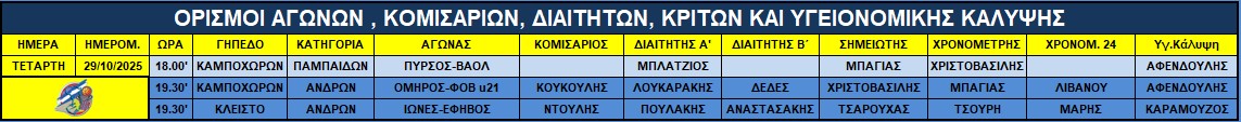 Αγώνες Τετάρτης 29 Οκτώβρη 2025