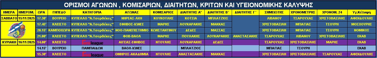 Αγώνες Σαββατοκύριακου 15-16 Νοεμβρίου 2025