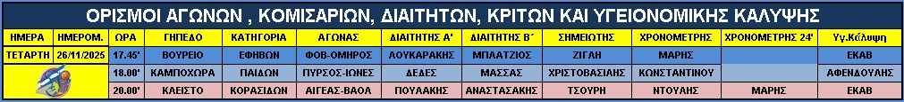 Aγώνες Τετάρτης 26 Νοεμβρίου 2025