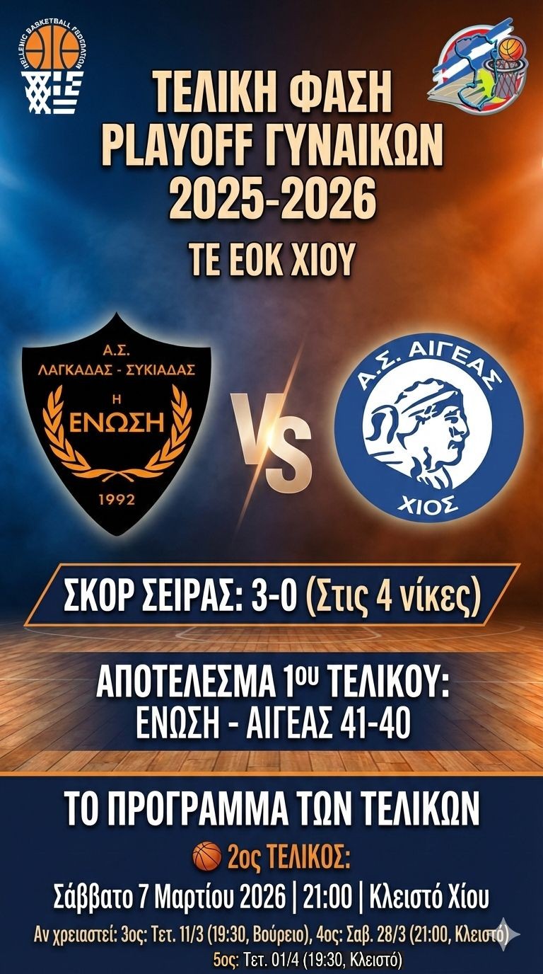 Χθες Τετάρτη 25 Φεβρουαρίου έγινε ο πρώτος τελικός για τα PlayOff Πρωταθλήματος Γυναικών ΤΕ ΕΟΚ Χίου 2025-2026 μεταξύ ΑΣ ΕΝΩΣΗ ΛΣ και ΑΣ ΑΙΓΕΑΣ , όπου μετά από ένα αγώνα με πολύ ένταση , ενναλαγές του σκορ και αγωνία η ΕΝΩΣΗ επικράτησε με 41-40 απέναντι στην πολύ καλή ομάδα του ΑΙΓΕΑ που προσπάθησε μέχρι το τελευταίο δευτερόλεπτο για την νίκη και έκανε το σκορ στην σειρά των τελικών 3-0 υπέρ της. Έτσι λοιπόν ο πίνακας αγώνων διαμορφώνεται: