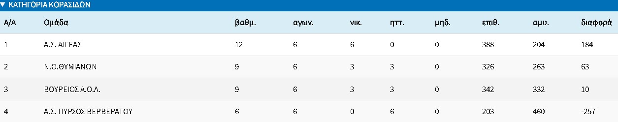 Ολοκληρώθηκε η κανονική περίοδος του Πρωταθλήματος Κορασίδων με την σειρά των τεσσάρων ομάδων βάση της βαθμολογίας να είναι: 1. ΑΙΓΕΑΣ, 2.ΝΟΘ, 3.ΒΑΟΛ και 4.ΠΥΡΣΟΣ.
