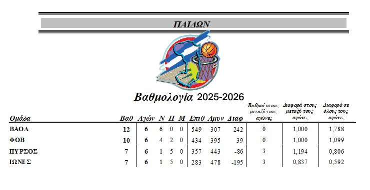 Ολοκληρώθηκε η κανονική περίοδος του Πρωταθλήματος Παίδων της ΤΕ ΕΟΚ Χίου 2025-2026 με την σειρά των τεσσάρων ομάδων βάση της βαθμολογίας να είναι: 1. ΒΑΟΛ, 2.ΦΟΒ, 3.ΠΥΡΣΟΣ και 4.ΙΩΝΕΣ