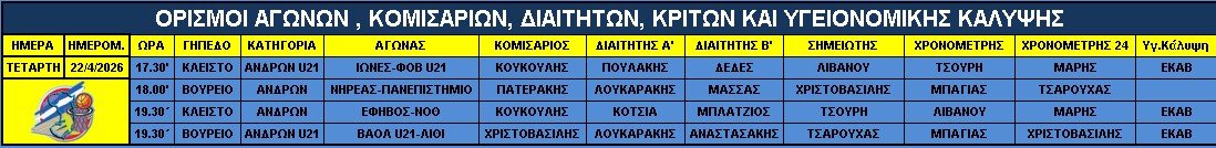 Αγώνες Τετάρτης 22 Απριλίου 2026