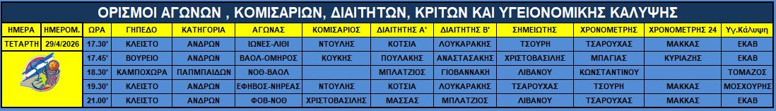 Αγώνες Τετάρτης 29 Απριλίου 2026